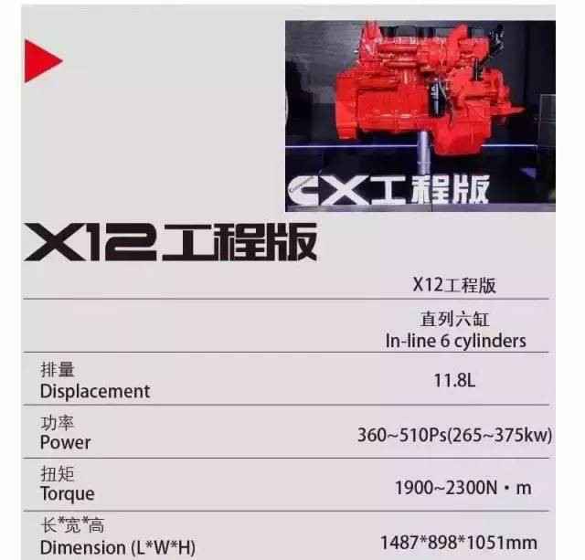 我们来看下X12工程版这款发动机的数据:11.8升,输出功率覆盖360-510马力,最大输出扭矩高达1900~2300牛.米。